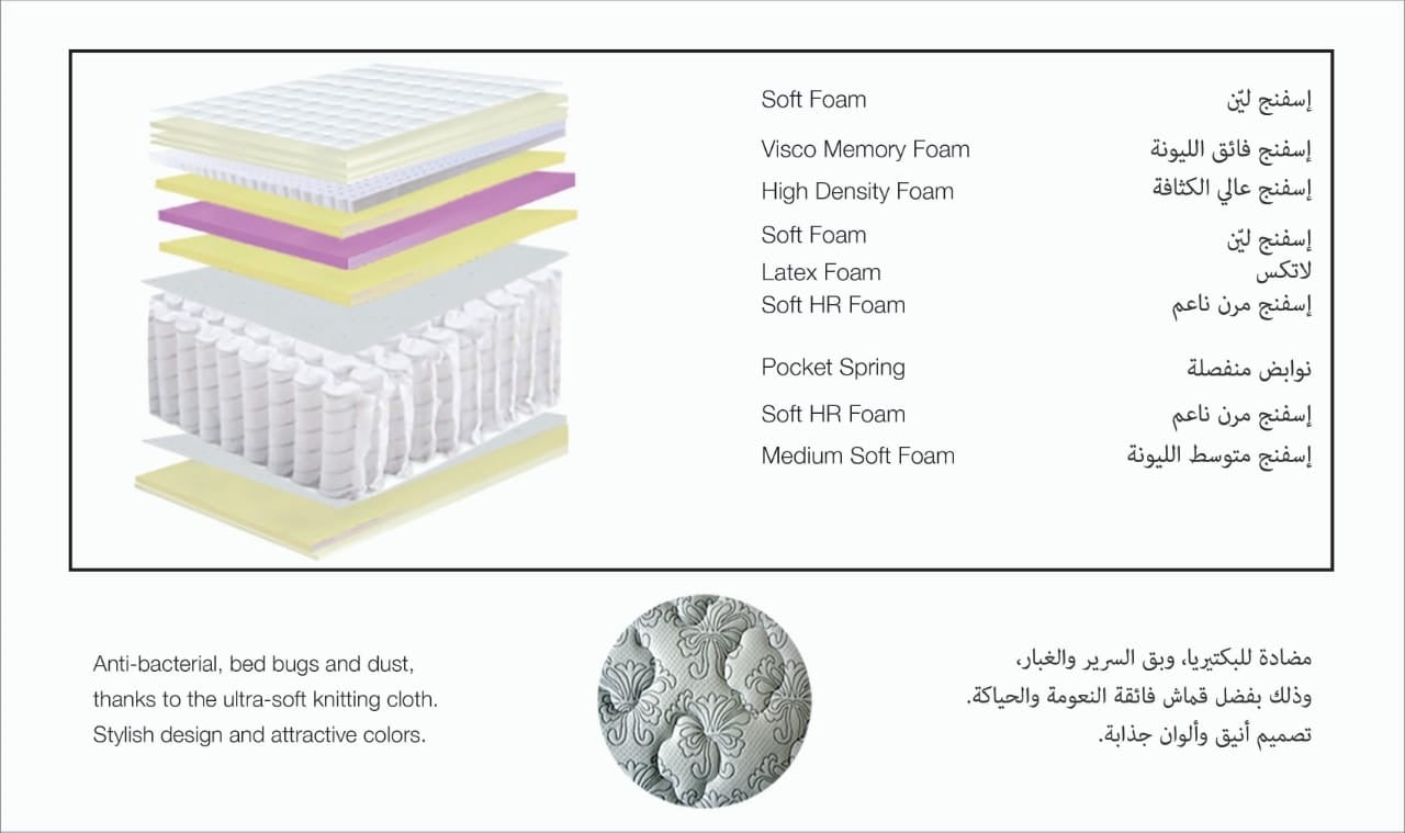 استمتع براحة لا مثيل لها ونومٍ عميق مع مرتبة سرير فاخرة انسى مشاكل الظهر والتوتر واستمتع بليالٍ هادئة ومريحة. احصل على مرتبة توفر دعمًا مثاليًا لجسمك وتقلل من حركة الشريك، مما يضمن لك نومًا هانئًا ومنتعشًا. تصميم فاخر وجودة عالية تجعل هذه المراتب مستثمرًا رائعًا لصحتك وراحتك