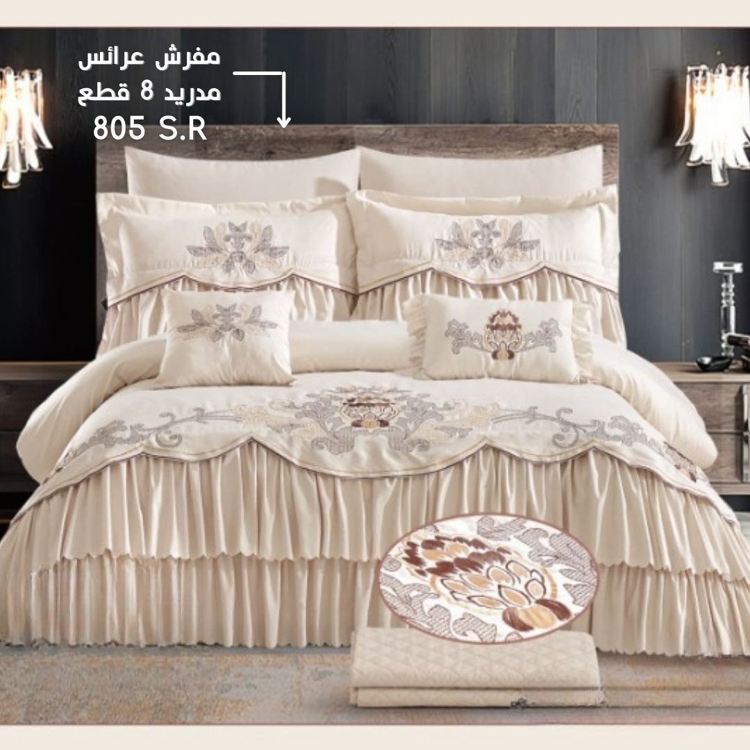 اجعل ليلة زفافك تبقى في ذاكرتك إلى الأبد مع مفرش العرائس الفاخر الذي يجمع بين الجمال والراحة الفائقة تصميمه الأنيق والمواد الناعمة والجودة العالية جعلته خيارًا مثاليًا للأزواج الذين يبحثون عن تجربة نوم مميزة وتمتاز بتوفر الأبعاد المحددة ملاءمة مثالية للسرير بالإضافة إلى الشرشف المغاط الذي يوفر حماية إضافية للفراش.
